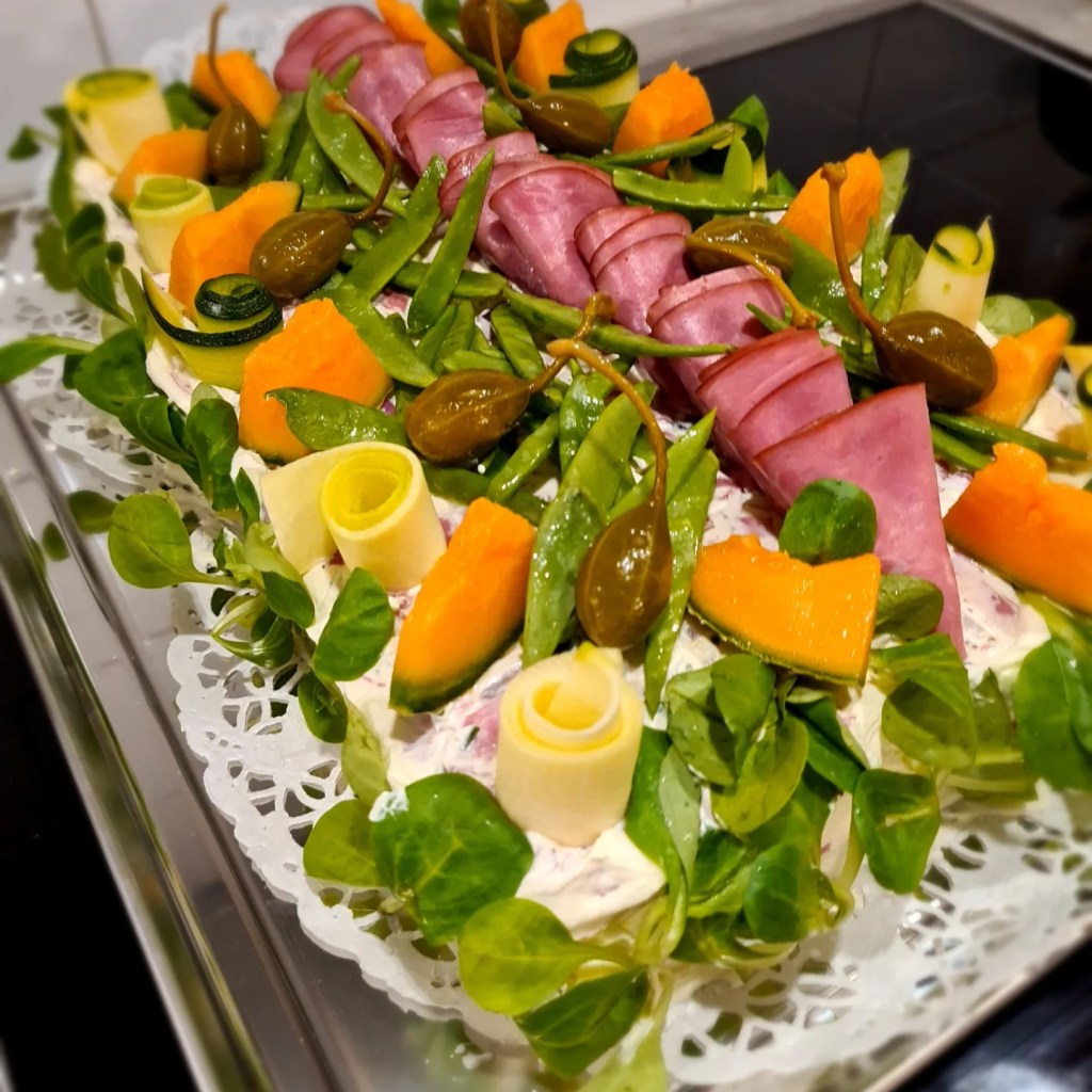 Machésallad, melon, coctailkapris, hamburgerkött, zucchini, sockerärter.