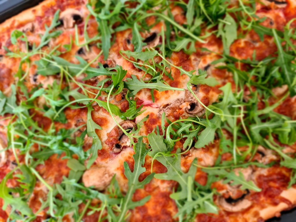 3. Kavla ut degen i en långpanna. Bred ut tomatsåsen. Lägg på skinka, salami, champinjoner och till sist ost. Grädda 10 minuter på 225 grader. Strö över rucola.