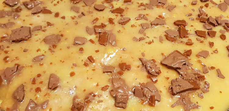 4. Bred ut smeten i formen och tryck ner dumle. Strö på toppingen. Grädda mitt i ugnen ca 25 minuter. Skär i rutor.