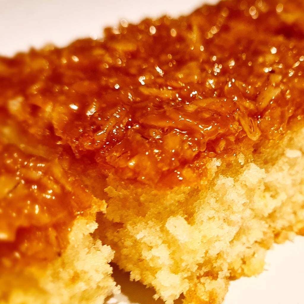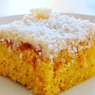 2. Gör små hål i kakan, tex med gaffel. Gör glasyren. Smält smöret och blanda i resten av ingredienserna. Bred på glasyren och strö över kokos.