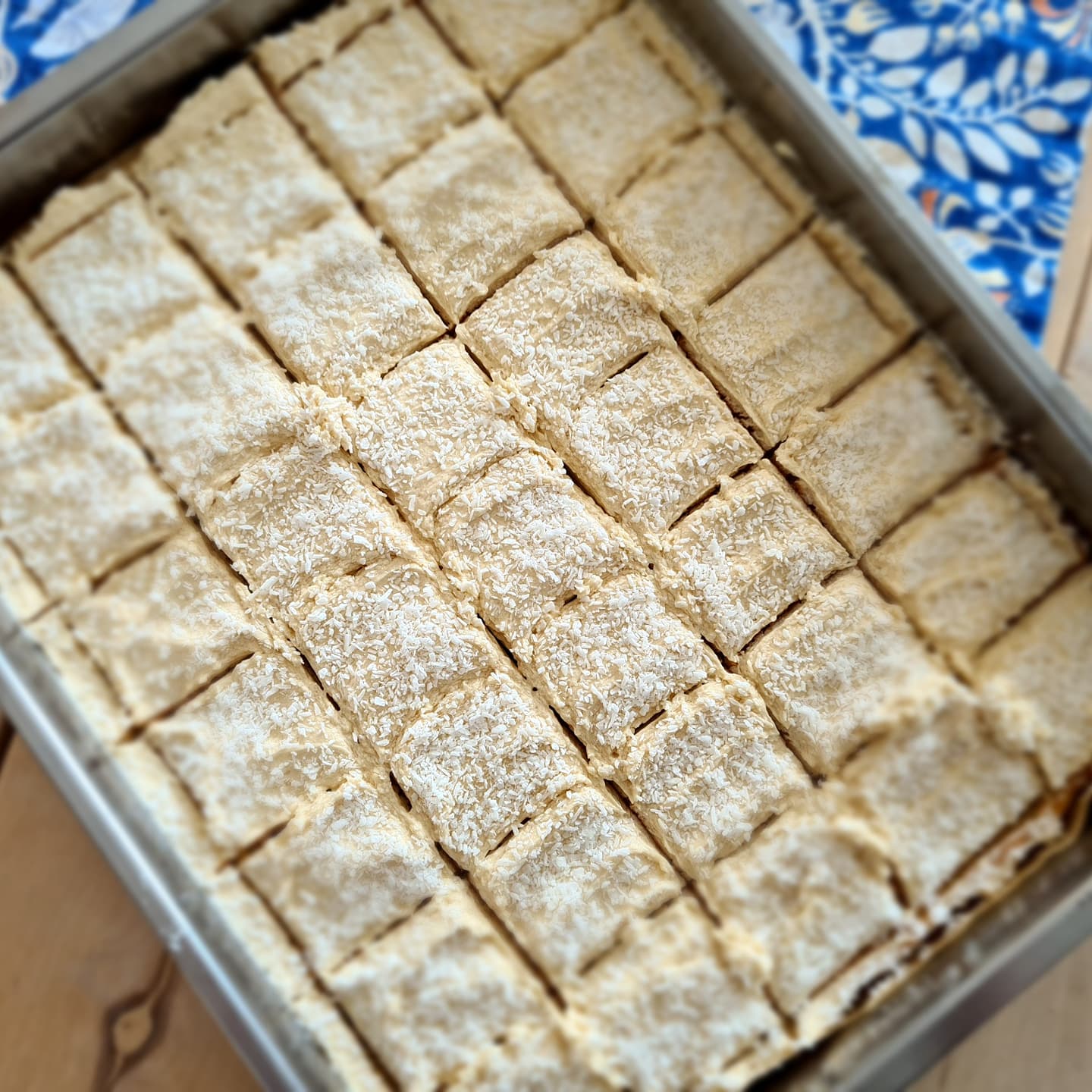 4. Smält smöret till glasyren och låt svalna. Blanda sedan ihop samtliga ingredienser i en skål till en slät glasyr. Bred på kakan och strö över kokos. Skär sedan i rutor.