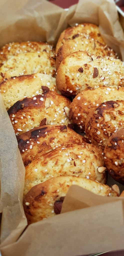 - Ta upp degen på mjölat bakbord. Forma till 2 rullar. Dela i 12 bitar vardera. Lägg på plåt. Pensla med gräddfil och strö på gräddfil och mandel.