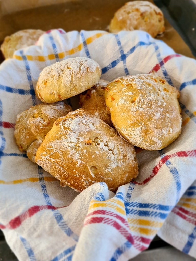 3. Ta upp degen på mjölat bakbord och knåda den. Tillsätt mer mjöl om det behövs. Dela degen i 15 bitar och lägg på plåt med bakplåtspapper. Lägg en bakduk över och låt jäsa 30 minuter. Grädda på 250 grader ca 12 minuter.