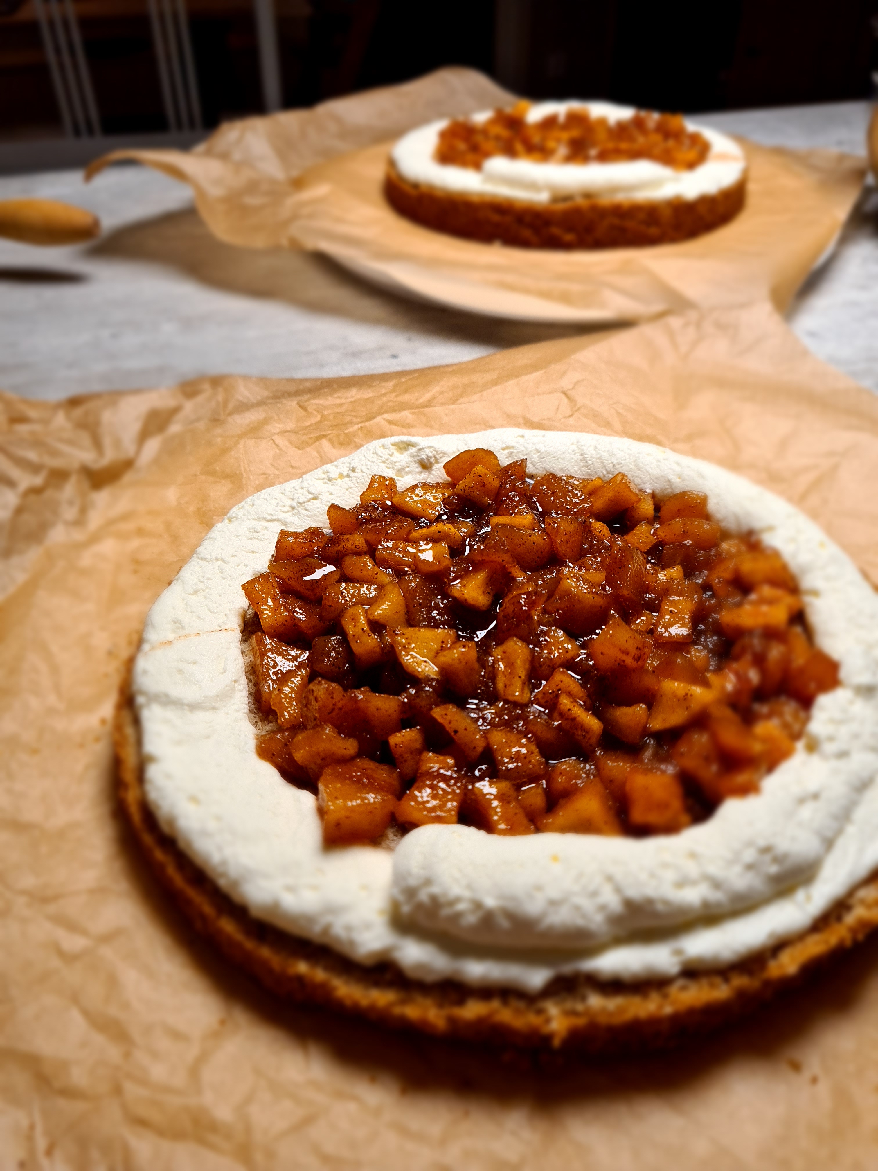 5. Vispa grädden. Dela tårtbotten i tre delar. Spritsa en kant med grädde på första lagret. Resten spritsar du vaniljkräm på (men spara ca 1/3 vaniljkräm). Lägg på nästa lager och spritsa en kant med grädde. Resten fyller du med kompotten. Blanda hälften av grädden med vaniljkrämen som är kvar. Bred ut gräddvaniljkrämen som en kupol ovanpå kompotten. Lägg till sist på sista lagret och bred grädde runt om. Kavla ut marsipanen till ca 3 mm tjock. Lägg den över tårtan och försök smeka bort ev. veck. Skär bort överflöd. Garnera med att pudra florsocker och lägg på torkade äppelskivor.