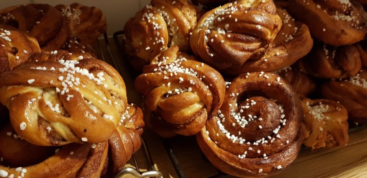 Byt håll efter ett tag. Lägg på plåt klädd med bakplåtspapper och låt jäsa ca 25 minuter. Pensla med ägg och strö på pärlsocker. Grädda i ugn på 225 grader varmluft ca 10 minuter.