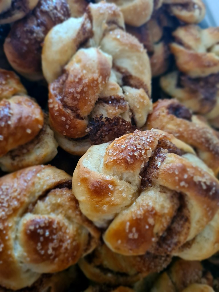 Ta upp degen på bakbordet. Knåda. Dela i 4 delar. Kavla ut rektangulärt. Bred på smör och strö sedan sockerblandningen på. Vik degen dubbel. Kavla ut lite lätt. Dela degen i remsor, ca 1,5 cm breda. Ta två remsor och snurra dem till en bulle. Låt jäsa 25 min på plåt. Pensla med ägg och strö över socker. Grädda i 225 grader ca 8 min. Mums!