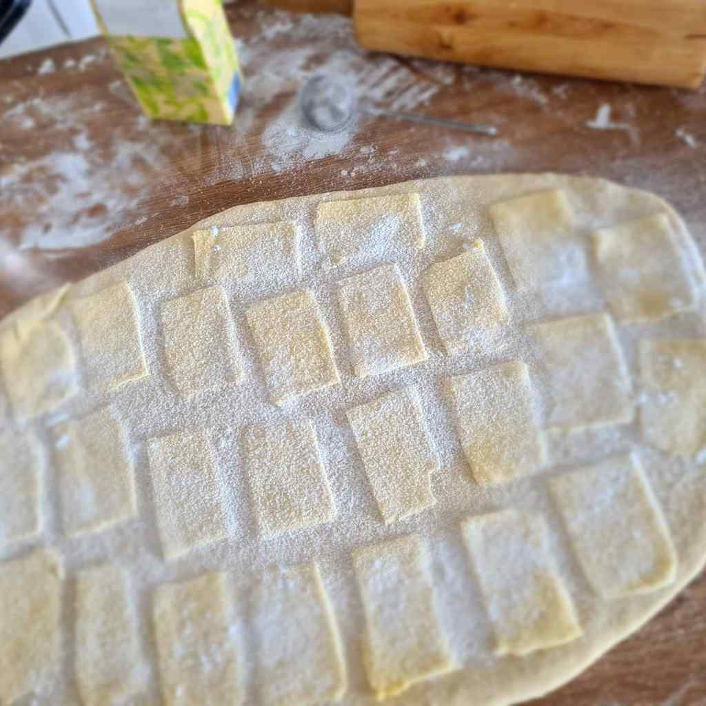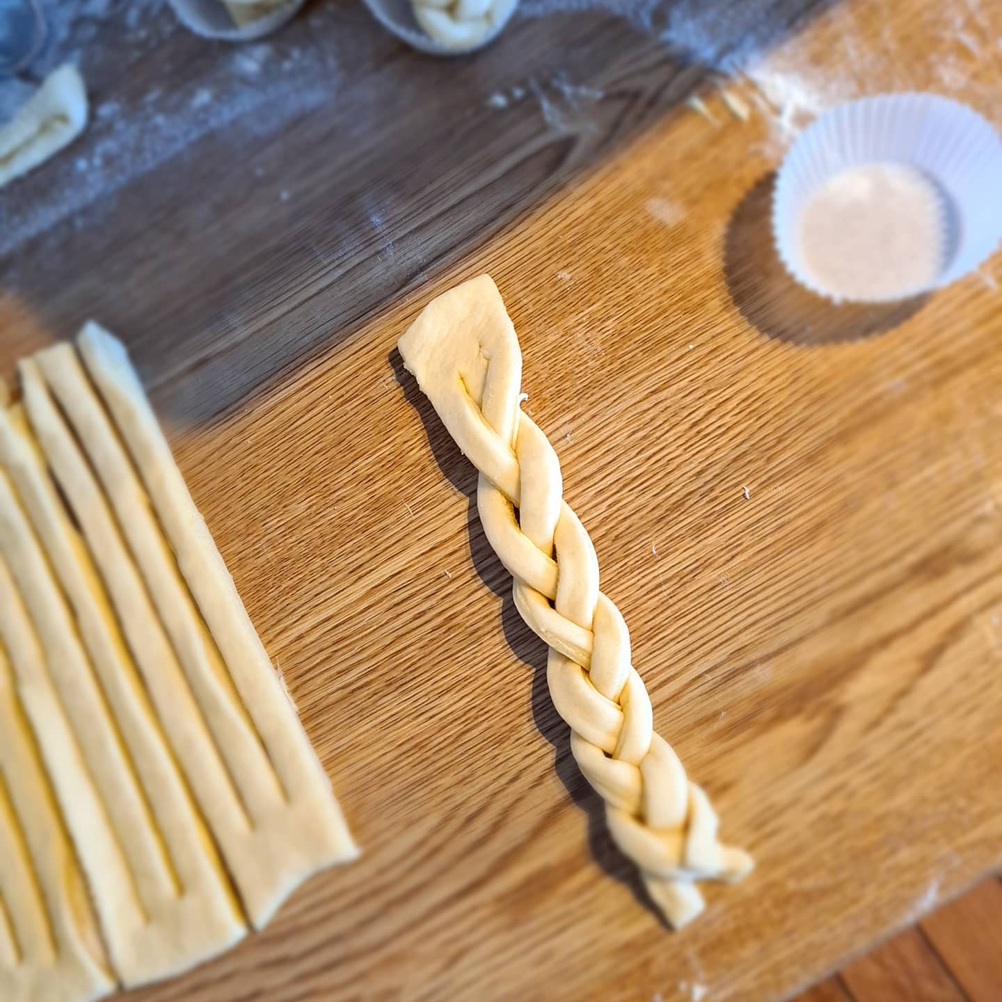 6. Kavla ut varje del till en rektangel. Bred ut fyllningen och vik ihop dubbelt. Kavla lätt igen. Skär sedan ut tunna remsor av degen. Ta två (eller tre beroende på storlek) remsor och snurra runt två fingrar.