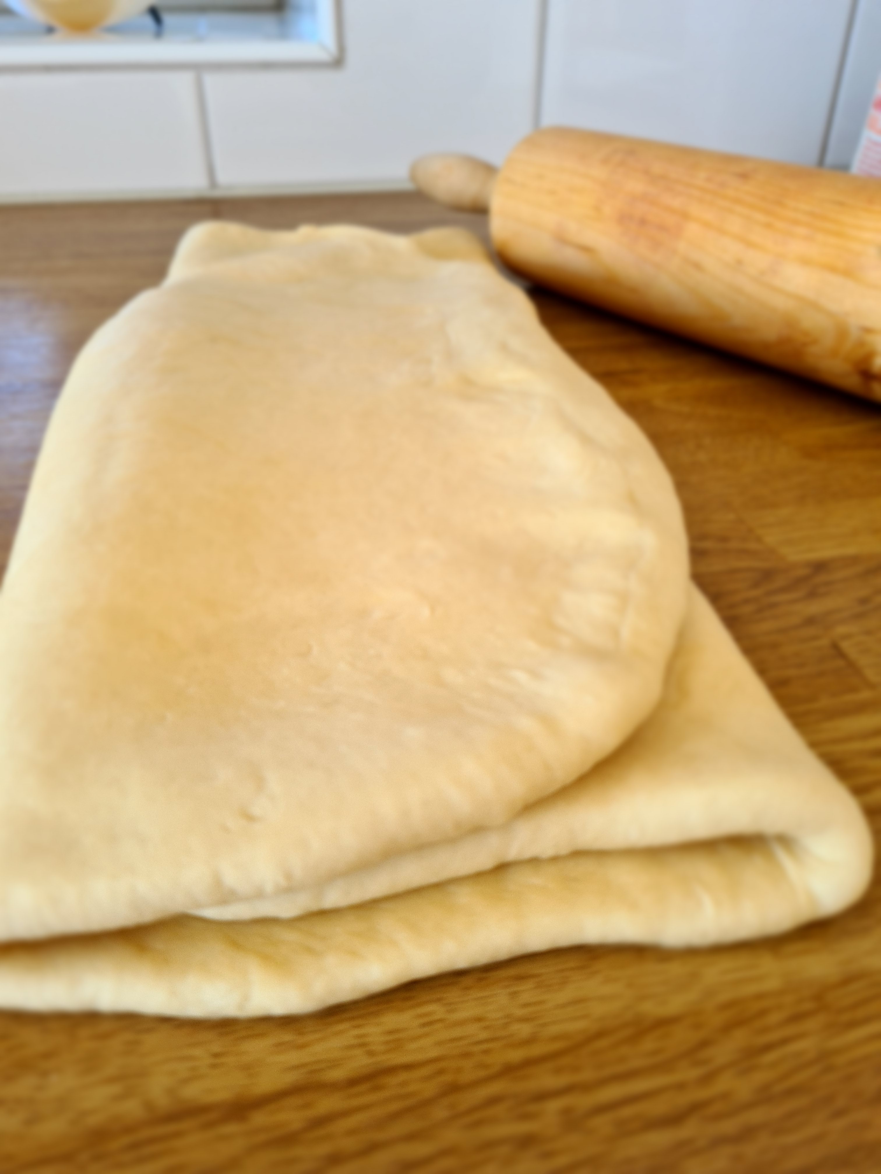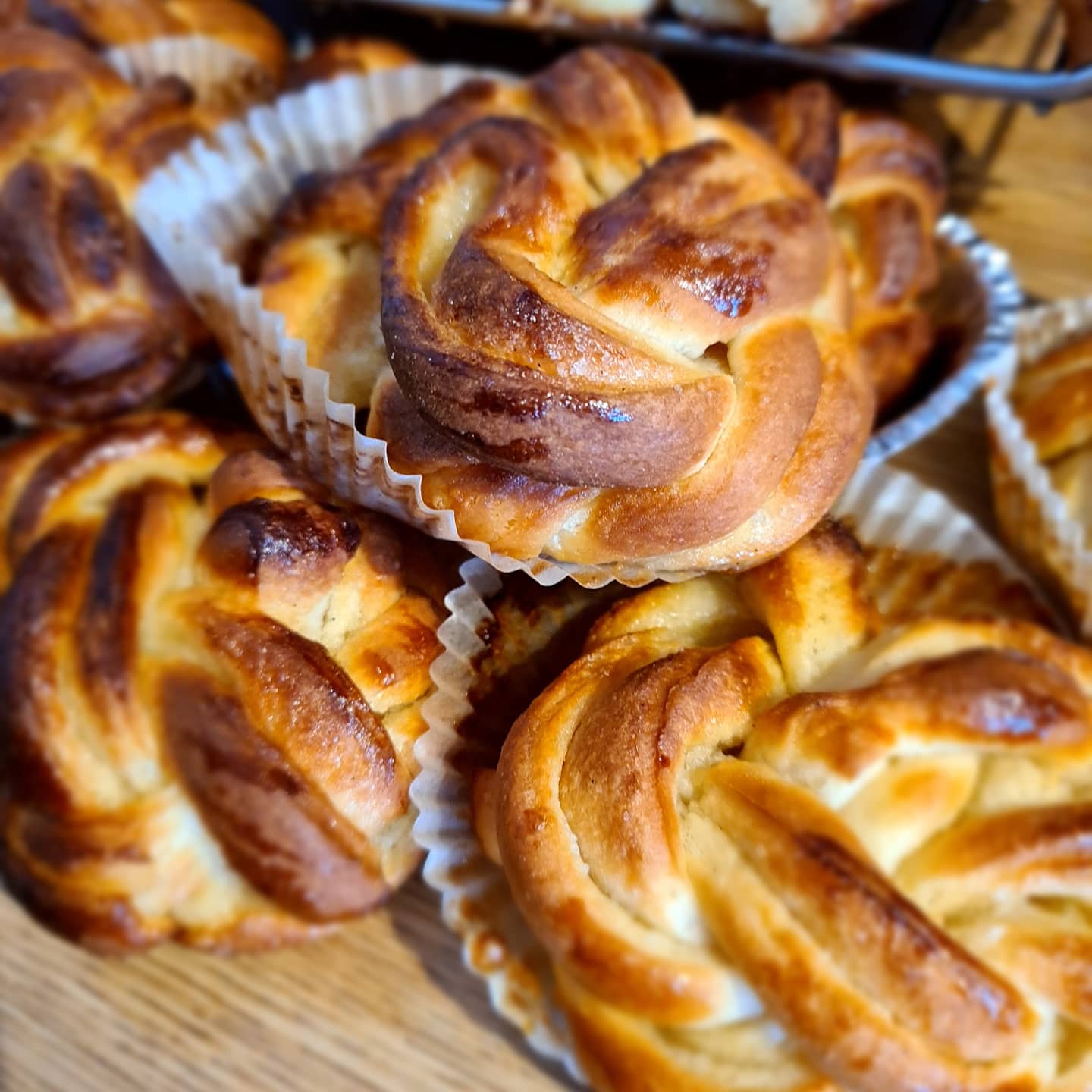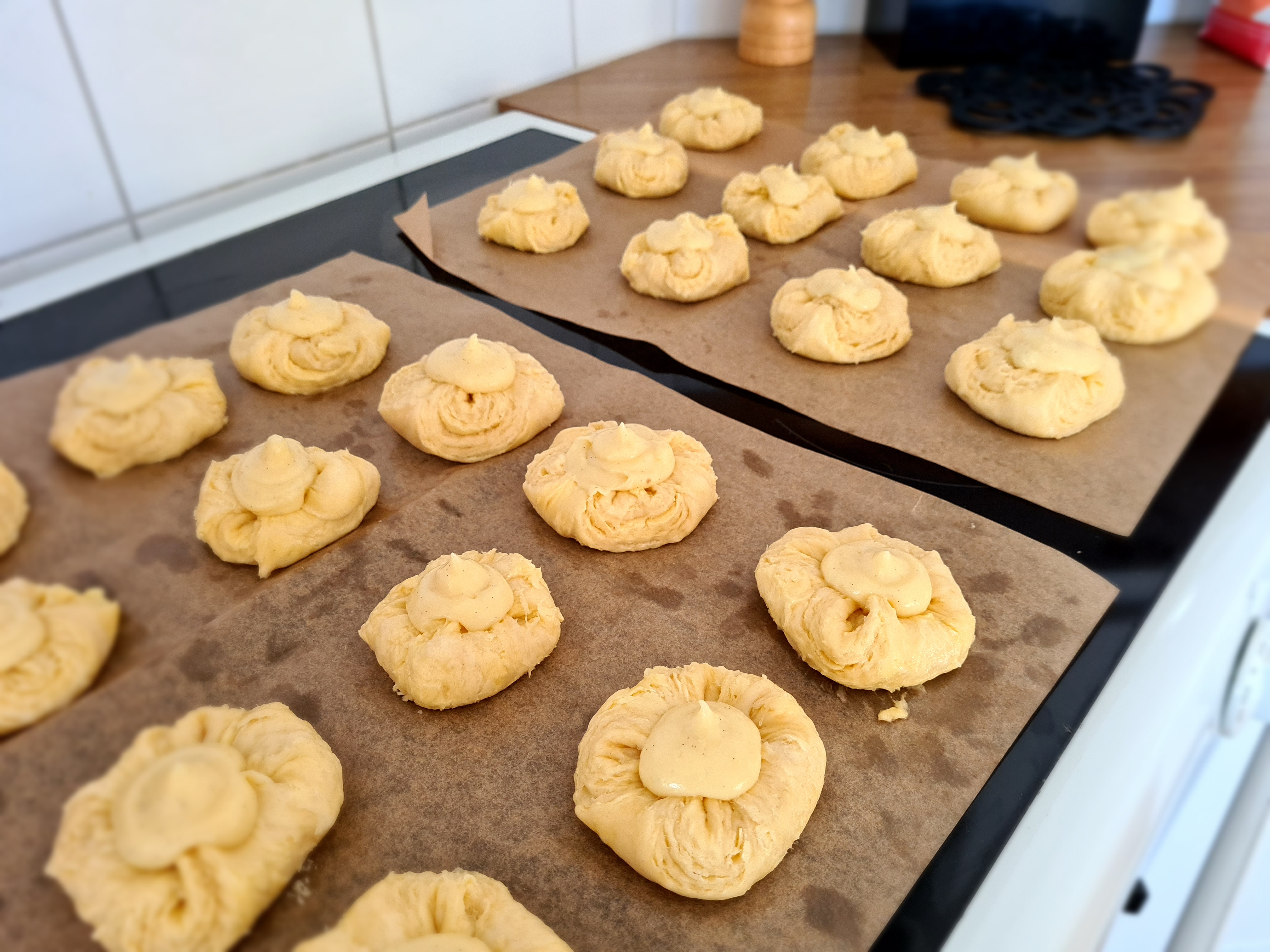 3. Kavla ut degen till en rektangel. Skär smöret i 10 skivor och lägg på ena halvan av degen. Lägg över den andra halvan. Kavla ut till en kvadrat och vik sedan i 3-slag. Plasta och vila i kylen 30 min. Kavla ut degen till en rektangel och vik sedan i 4-slag. Plasta och vila i kylen 30 min. Kavla ut degen igen och vik 3-slag. Låt vila i kylen 30 min. Kavla ut degen till 40×48 cm. Skär utan rutor 8×8 cm och vik in hörnen på varje ruta mot mitten. Lägg på plåt och låt jäsa 90 minuter. Lägg på en klick vaniljkräm I mitten och grädda ca 13 min på 200 grader.